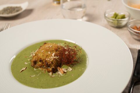 Sea bass fillet with ‘hrusta’ crust and cream of chard