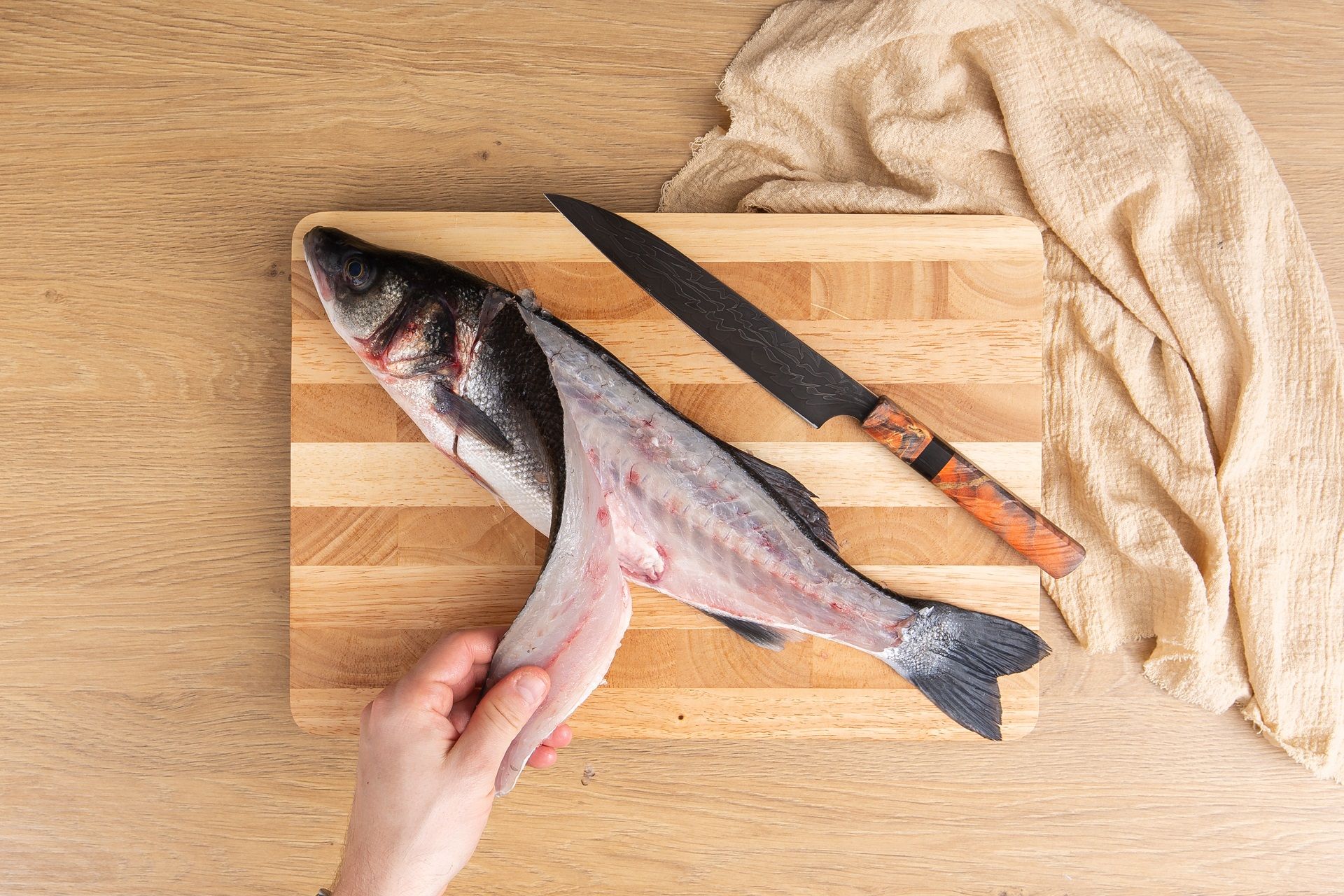 Očistite i isfiletirajte brancina. Nije potrebno skidati kožu s fileta brancina jer će vam ona olakšati rezanje mesa ribe.