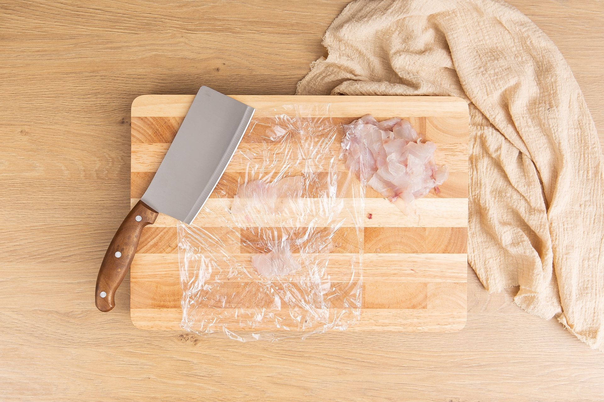 Drugi, i onaj koji bih vam osobno preporučio, je da meso brancina narežete najtanje što možete, a komade s čijom debljinom niste zadovoljni stavite između dva komada rastezljive folije i lagano ih istucite širokim predmetom na željenu debljinu.