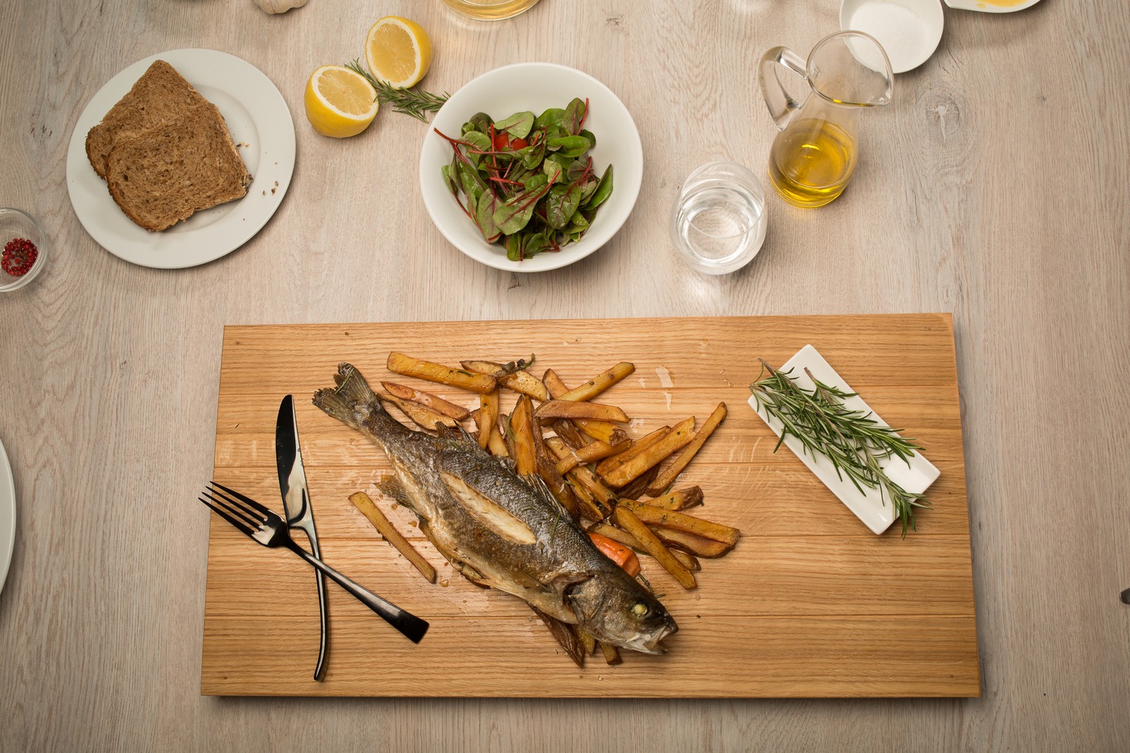 Brancin očistite i marinirajte 30 minuta u mješavini ulja, ružmarina i češnjaka. Krumpire s korom dobro operite i narežite na veće komade(pomfrit). Krumpiriće kratko prokuhajte u vodi (5 – 7 minuta), ocijedite i popržite u dubokoj masnoći. Gotovi krumpir posolite i začinite s malo ružmarina i sjeckanim češnjakom. Brancin pecite u prikladnoj tavi minutu s obje strane. Ribu stavite u vatrostalnu posudu i zapecite u pećnici 20 minuta na 180 °C. Vrijeme pečenja ovisi o veličini ribe. Pečenu ribu poslužite uz hrskavi prženi krumpir i dekorirajte po želji.