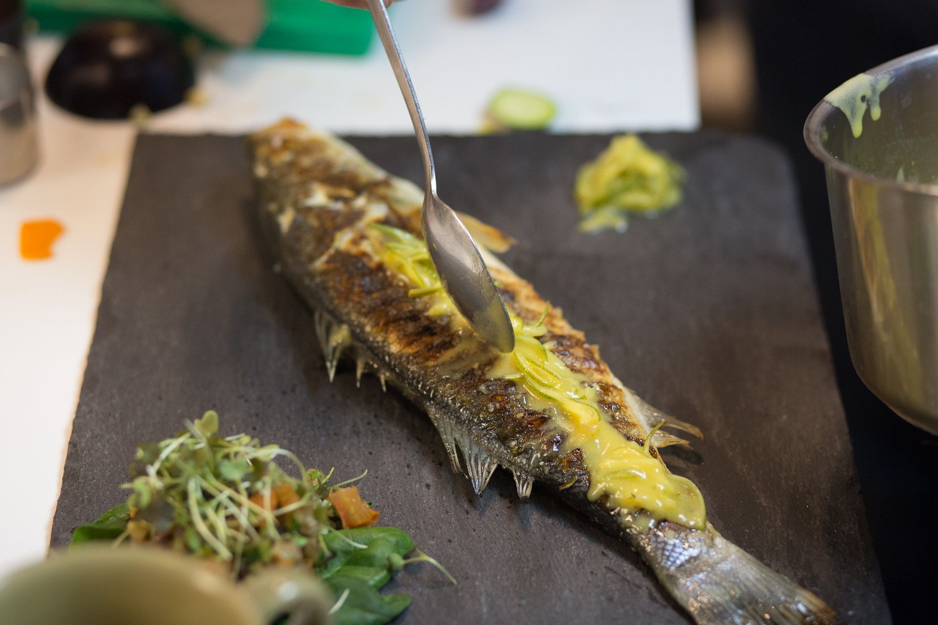 Za to vrijeme u posudi prokuhajte riblji temeljac, naribani đumbir, sitno sjeckanu koricu i sok od limete. Prokuhajte 10 minuta pa dodajte maslac i povežite s gustinom koji ste rastopili u 3 jušne žlice vode.