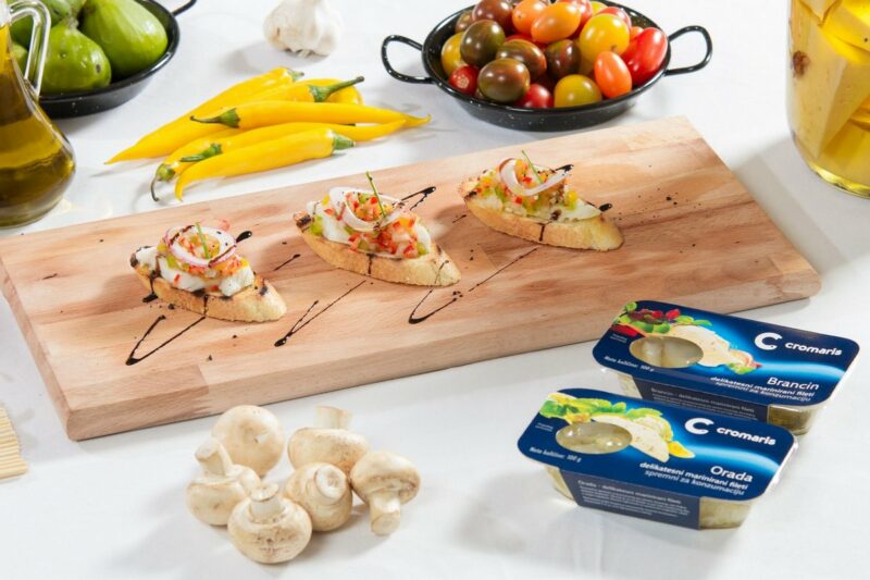 Mariniranu ribu ocijedite i izrežite na manje komade, povrće narežite na sitne kockice. Kruh ili tost namažite maslinovim uljem i kratko tostirajte.