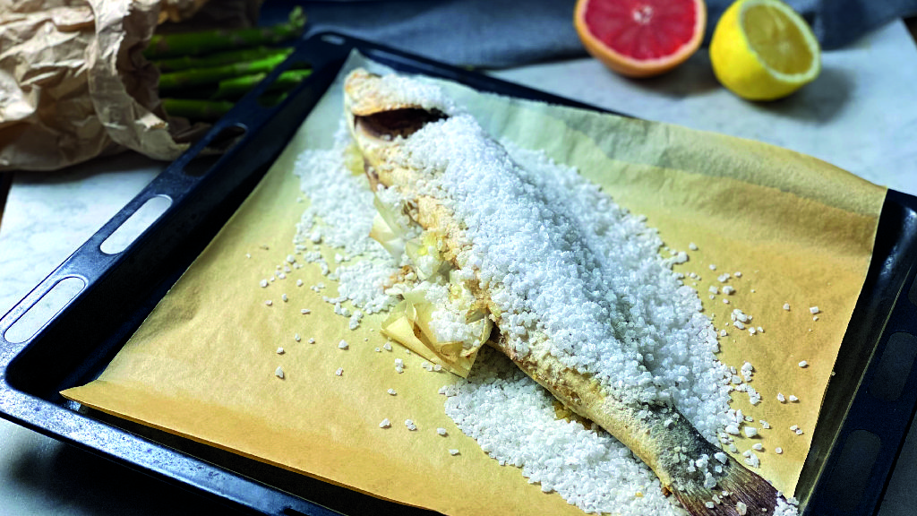 Prendete il branzino e adagiatelo sulla teglia del forno. Ponete della carta forno all’interno della pancia per proteggere il pesce dal sale. Coprite quindi l’intero branzino di sale grosso e infornate a 200 gradi per circa 30 minuti.