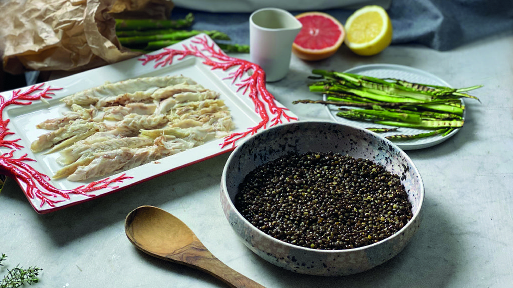 Preparate la vinaigrette mischiando la salsa thaina con quella di soia, il succo del pompelmo, qualche goccia di succo di limone, olio, sale e pepe. Sfornate il pesce, eliminate la crosta del sale che si sarà formata, pulitelo e adagiatelo sopra le lenticchie, aggiungete ora gli asparagi e completate con la vinaigrette. Buon appetito!