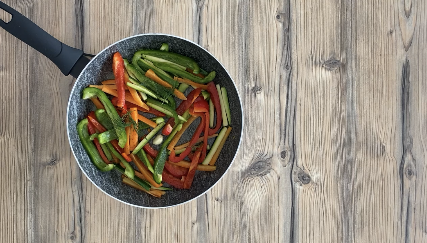 Lavate e tagliate le verdure alla julienne o a listarelle non troppo spesse. Fate soffriggere lo spicchio di aglio con l’olio di oliva in una padella antiaderente. Aggiungete le verdure e fate cuocere con coperchio fino a che non risultano leggermente appassite. Salate, aggiungete l’aneto e mescolate di tanto in tanto, poi eli-minate l’aglio e versate la salsa di soia, continuando la cottura. Dovranno risultare croccanti.