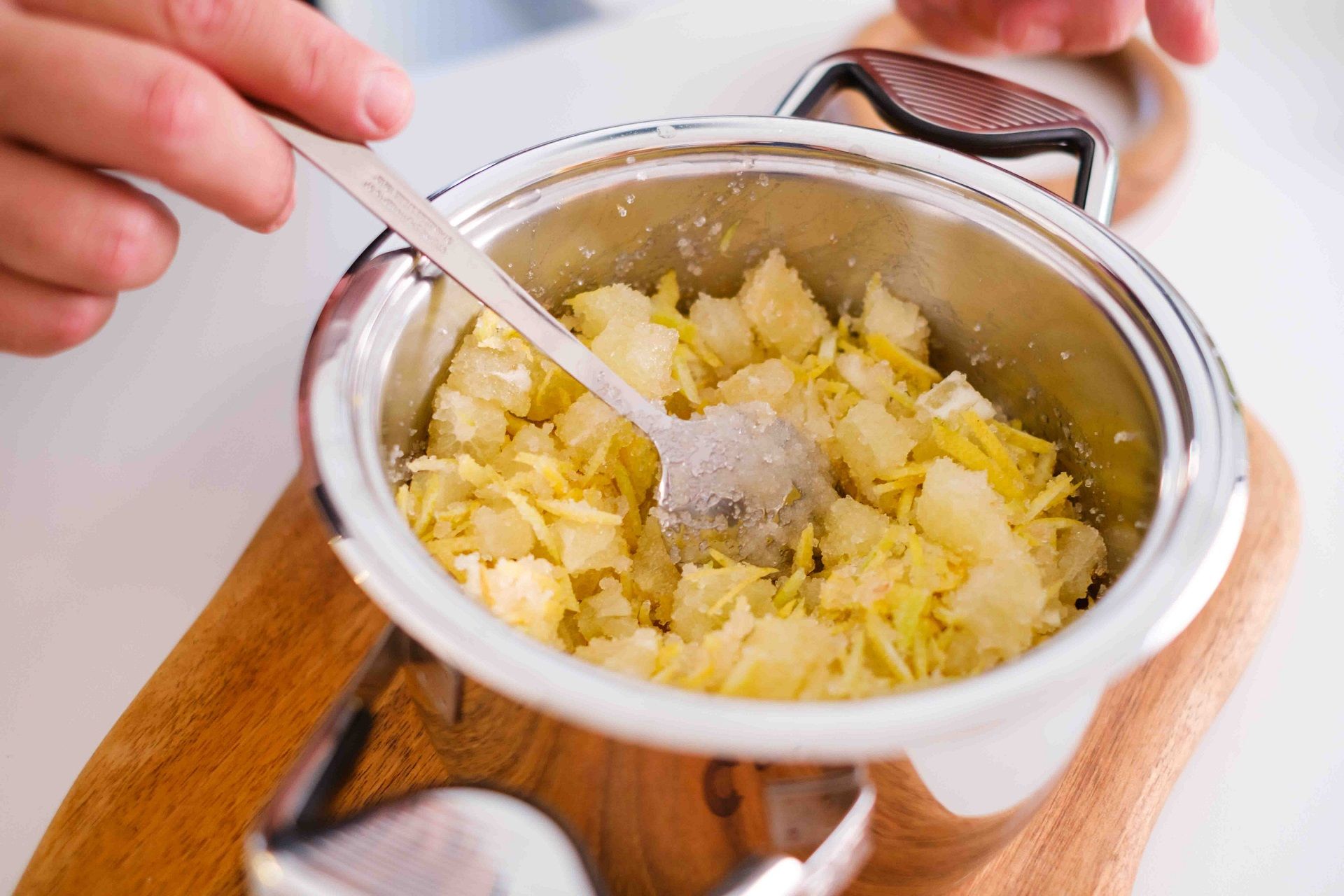 Per preparare la composta di limone, pulire e tagliare il peperoncino. Privare i limoni delle estremità e tagliarli in 3 parti, nel senso della lunghezza. Quindi, unirli allo zucchero e al peperoncino e lasciar riposare per 12 ore. Far cuocere in padella finché il composto non si caramella. Passare nel frullatore per ottenere una consistenza omogenea, aggiungere lo sciroppo di zucchero di canna e regolare con succo di limone.