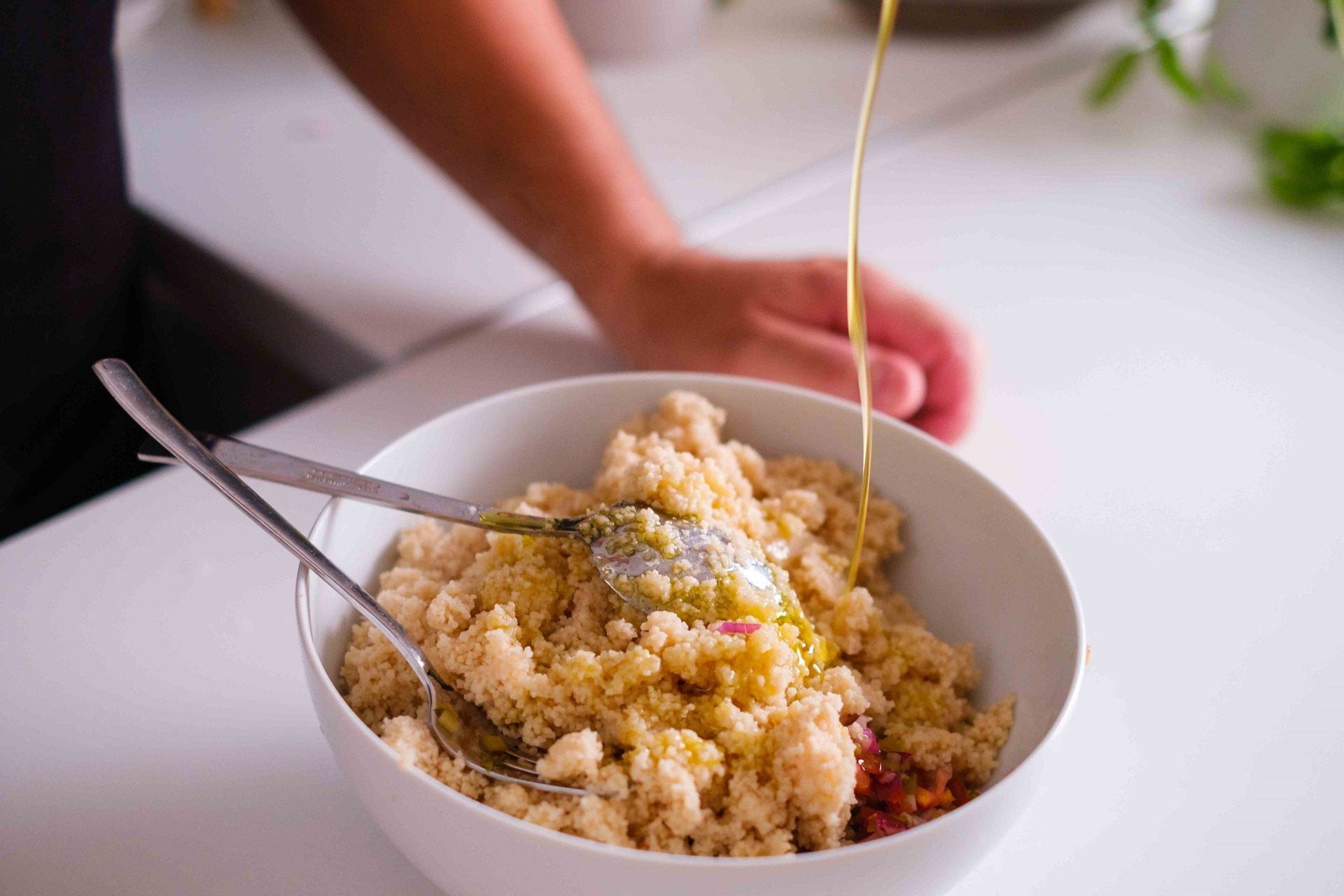 Portare l’acqua a bollore, aggiungere il couscous e cuocere a fuoco lento per due minuti, versare in un recipiente e coprire con la pellicola. Tagliare le verdure a cubetti e farle marinare per 5 minuti nell’aceto. Sgranare il couscous con la forchetta, aggiungere le verdure e la menta, regolare di sale.