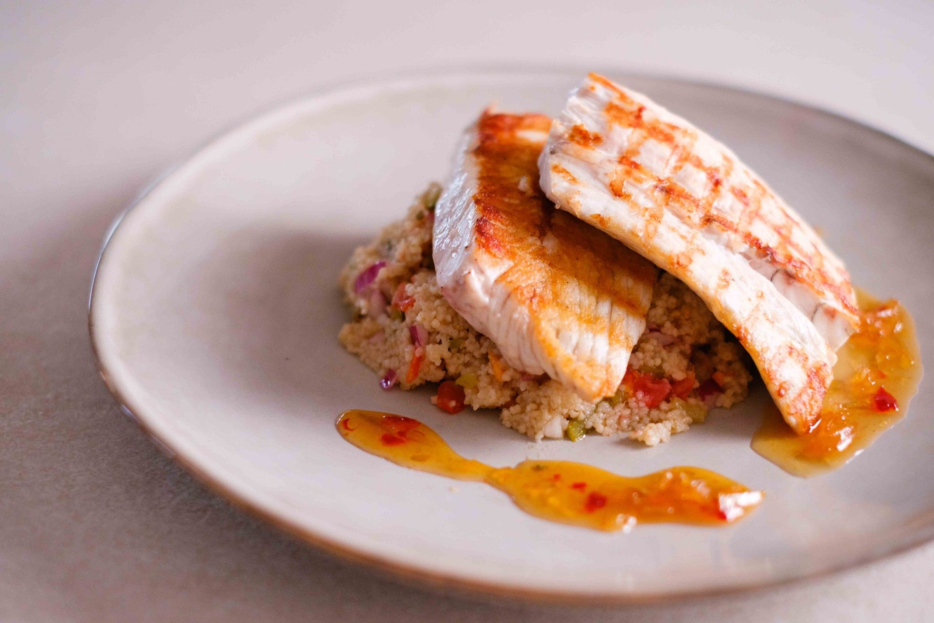 Spennellare dell’olio sulla pelle del pesce, posizionare i filetti sulla griglia calda e far cuocere per circa 8 minuti sul lato della pelle. Distribuire un cucchiaio di composta sul piatto e aggiungere il couscous. Adagiare i filetti di pesce sul couscous, aggiungere l’olio d’oliva rimanente e servire con uno spicchio di limone.