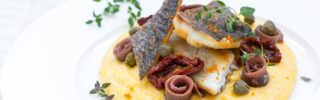 Salare e pepare a piacere i filetti di orata. Versare un po’ di olio nel tegame bollente. Quando l’olio diventa caldo, aggiungere l’orata, con la pelle rivolta in giù e lasciarla abbrustolire. Dopo qualche minuto, quando la pelle si abbrustolisce per bene, girare con delicatezza i filetti e completare lacottura (per alcuni minuti). Quando il pesce è pronto, si può tagliare a pezzettini più piccoli e sistemare attorno alla polenta. A fianco del pesce e della polenta distribuire qualche acciuga sotto sale, pomodori secchi e capperi. Decorare ulteriormente con le foglioline di timo e con la scorza grattugiata dell’arancia per un sapore e una presentazione ancora più speciale.
